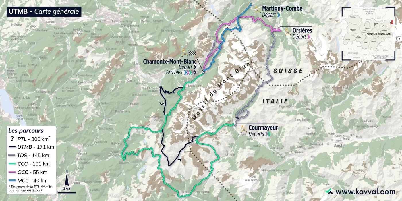 L'épreuve propose désormais 7 courses traversant 3 pays, sur des distances variées : de 40 à 300 km et de +2 300 à +10 000 D+. Il rassemble des dizaines de milliers de coureurs chaque année.