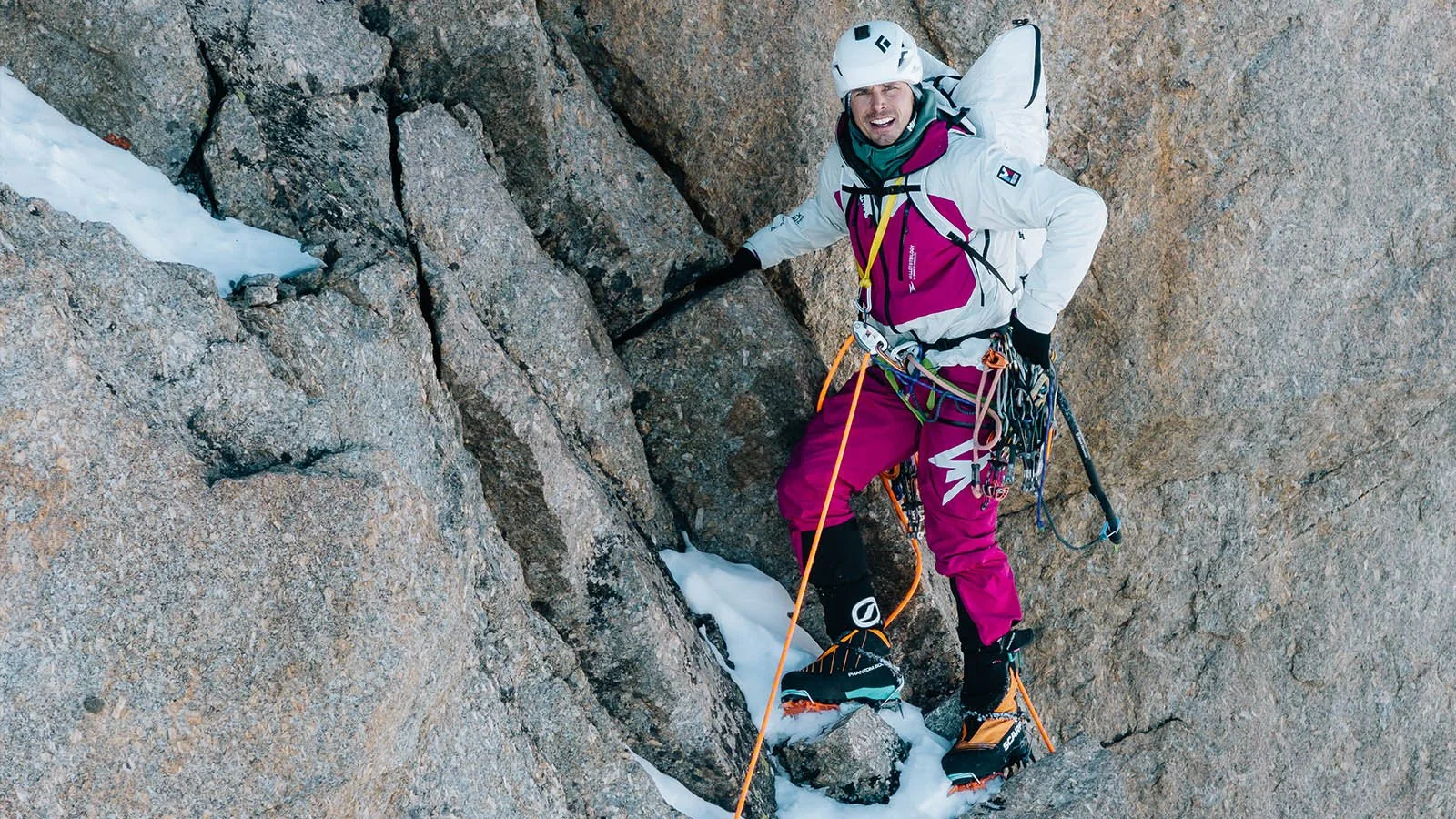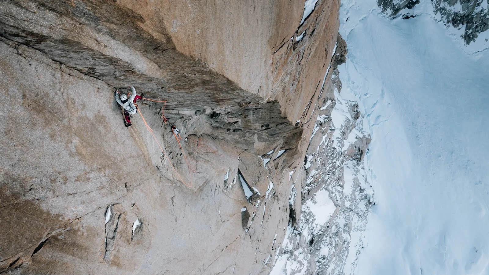 Il enchaîne les longueurs d’escalade (sections de corde) sur des pentes de glace, des murs de rocher, parfois jusqu’au niveau 7b, tout en transportant et hissant son matériel. Chaque nuit, il bivouaque dans la paroi, sur des plateformes précaires, suspendu au-dessus du vide.